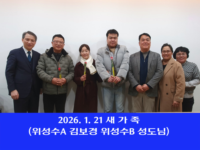2026.01.21 새가족(3명) 페이지 정보 작성자 관리자 작성일26-01-26 09:01 조회57회 댓글0건 관련링크 목록 본문 환영합니다. 댓글목록 등록된 댓글이 없습니다. 목록